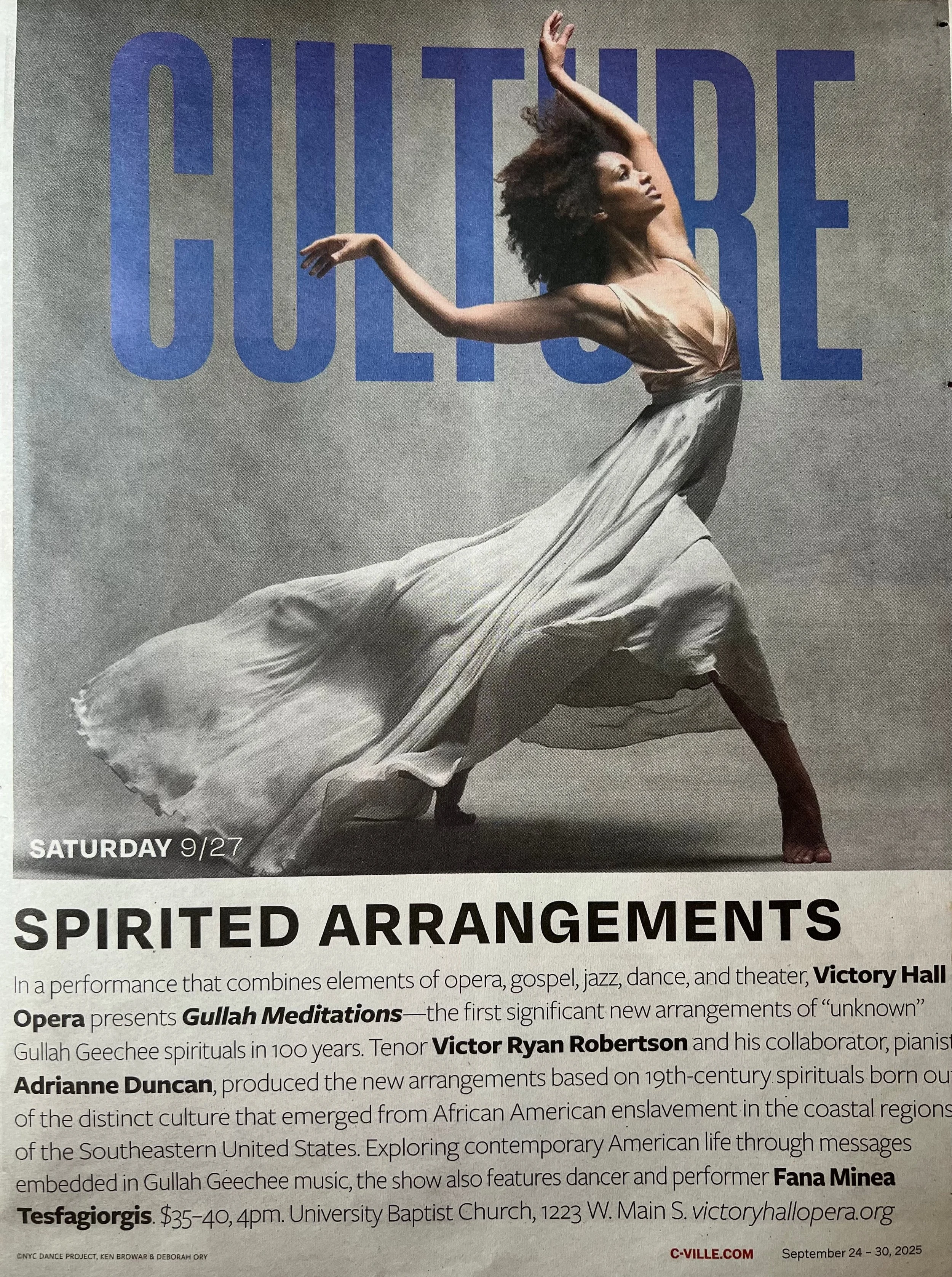 While performing at the Spoleto Festival, GRAMMY®-nominated tenor Victor Ryan Robertson (Metropolitan Opera, Royal Albert Hall, Kennedy Center) was given an out-of-print edition of sheet music of little-known 19th-century Gullah Geechee spirituals from the islands off the coast of his home state of South Carolina. The history, melodies and lyrics resonated deeply with him. In 2022, he invited his friend and colleague – pianist, composer and Georgia native Adrianne Duncan – to set the a cappella melodies to music that reflected their backgrounds in opera, jazz and classical music. Their hope is that this contemporary take on spirituals from the rich Gullah Geechee culture will help preserve and bring forward this profoundly moving music to a new and wider audience.